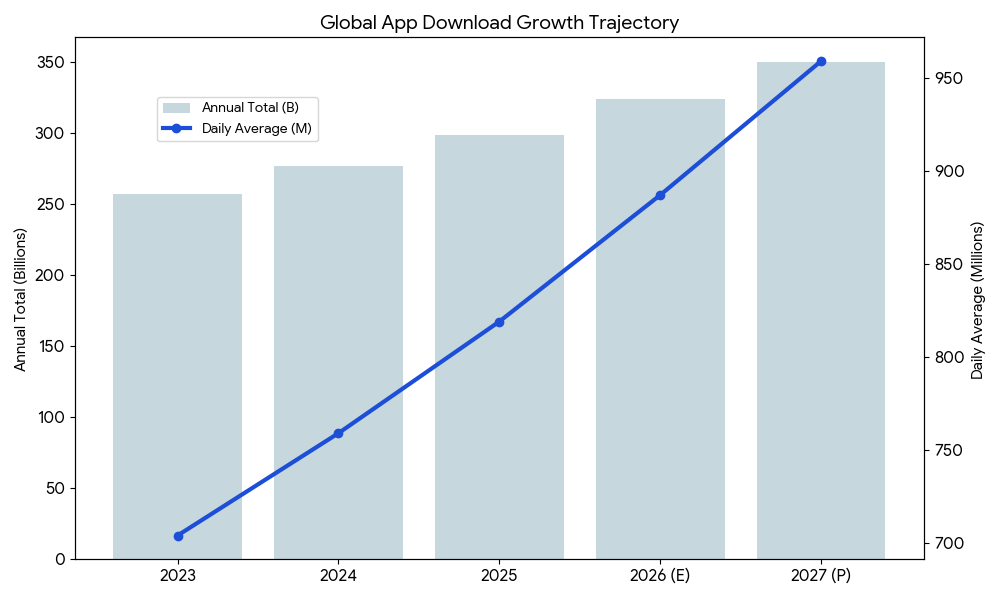 | Year | Annual Downloads (Billion) | Daily Average (Million) | YoY Growth | Market Catalyst |